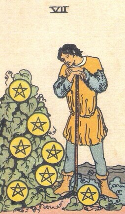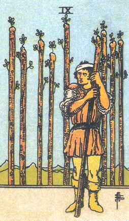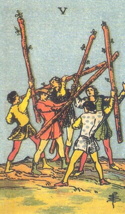 劍5逆位、杖9正位、太陽逆位、教宗正位、命輪逆位