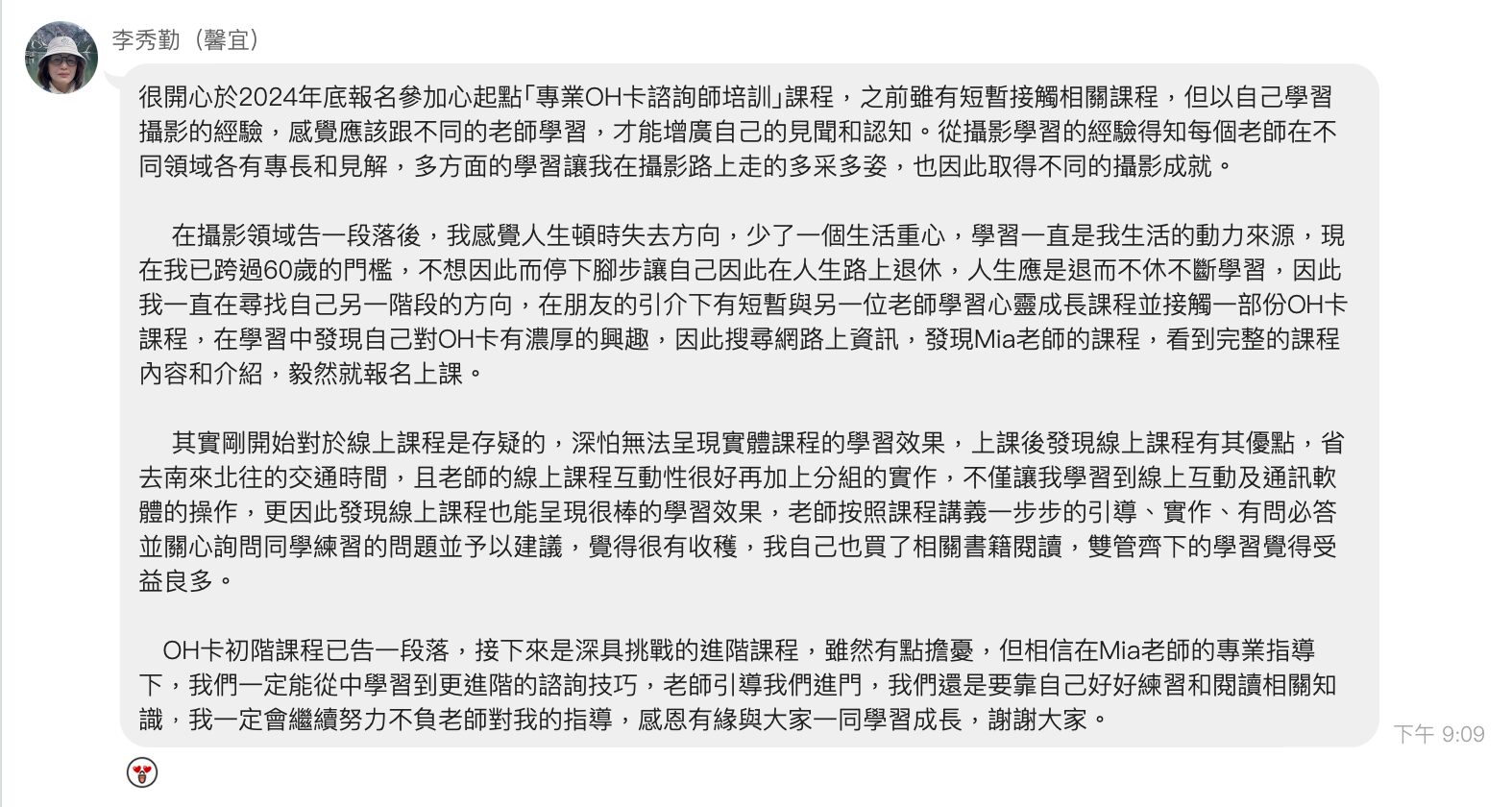 在攝影領域告一段落後,我感覺人生頓時失去方向,少了一個生活重心,學習一直是我生活的動力來源,現在我已跨過60歲的門檻,不想因此而停下腳步讓自己因此在人生路上退休,人生應是退而不休不斷學習,因此我一直在尋找自己另一階段的方向,在朋友的引介下有短暫與另一位老師學習心靈成長課程並接觸一部份OH卡課程,在學習中發現自己對OH卡有濃厚的興趣,因此搜尋網路上資訊,發現Mia老師的課程,看到完整的課程內容和介紹,毅然就報名上課。