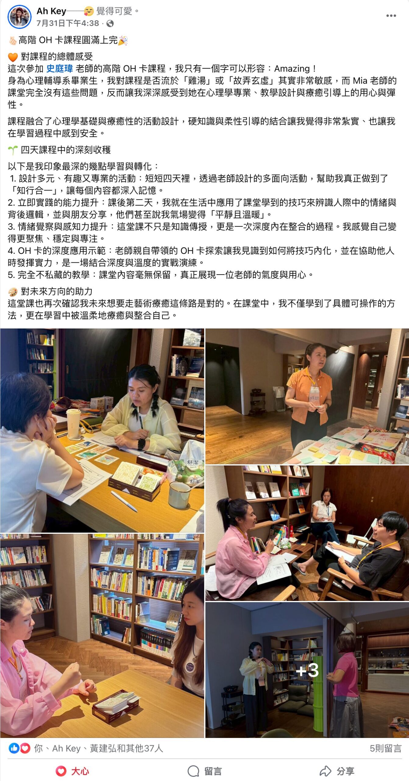 身為心理輔導系畢業生,我對課程是否流於「雞湯」或「故弄玄虛」其實非常敏感,而 Mia 老師的課堂完全沒有這些問題,反而讓我深深感受到她在心理學專業、教學設計與療癒引導上的用心與彈性。