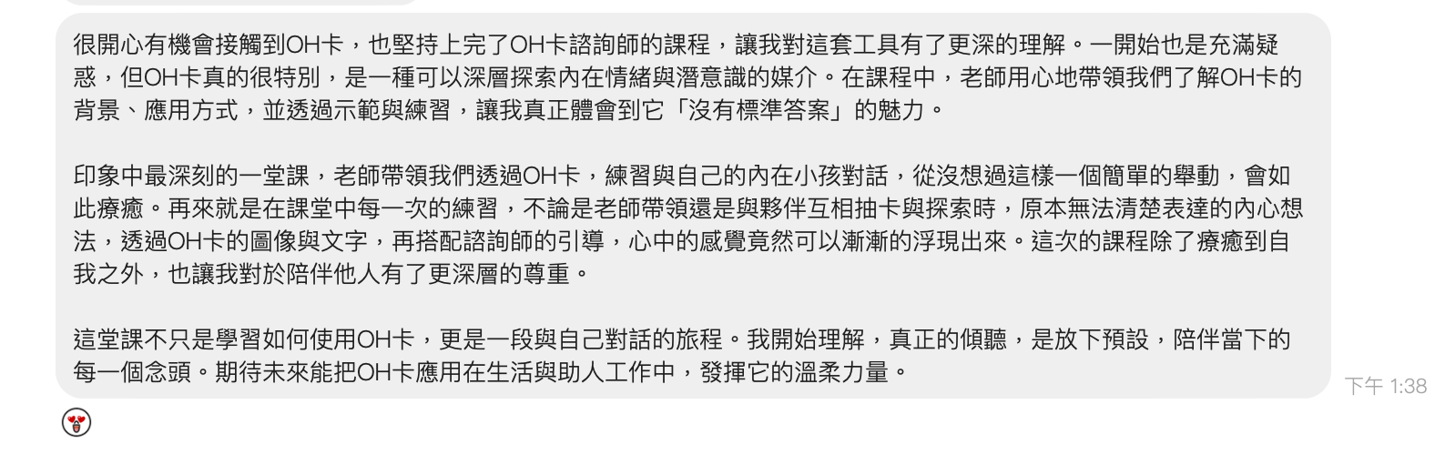 這堂課不只是學習如何使用OH卡,更是一段與自己對話的旅程。我開始理解,真正的傾聽,是放下預設,陪伴當下的每一個念頭。期待未來能把OH卡應用在生活與助人工作中,發揮它的溫柔力量。