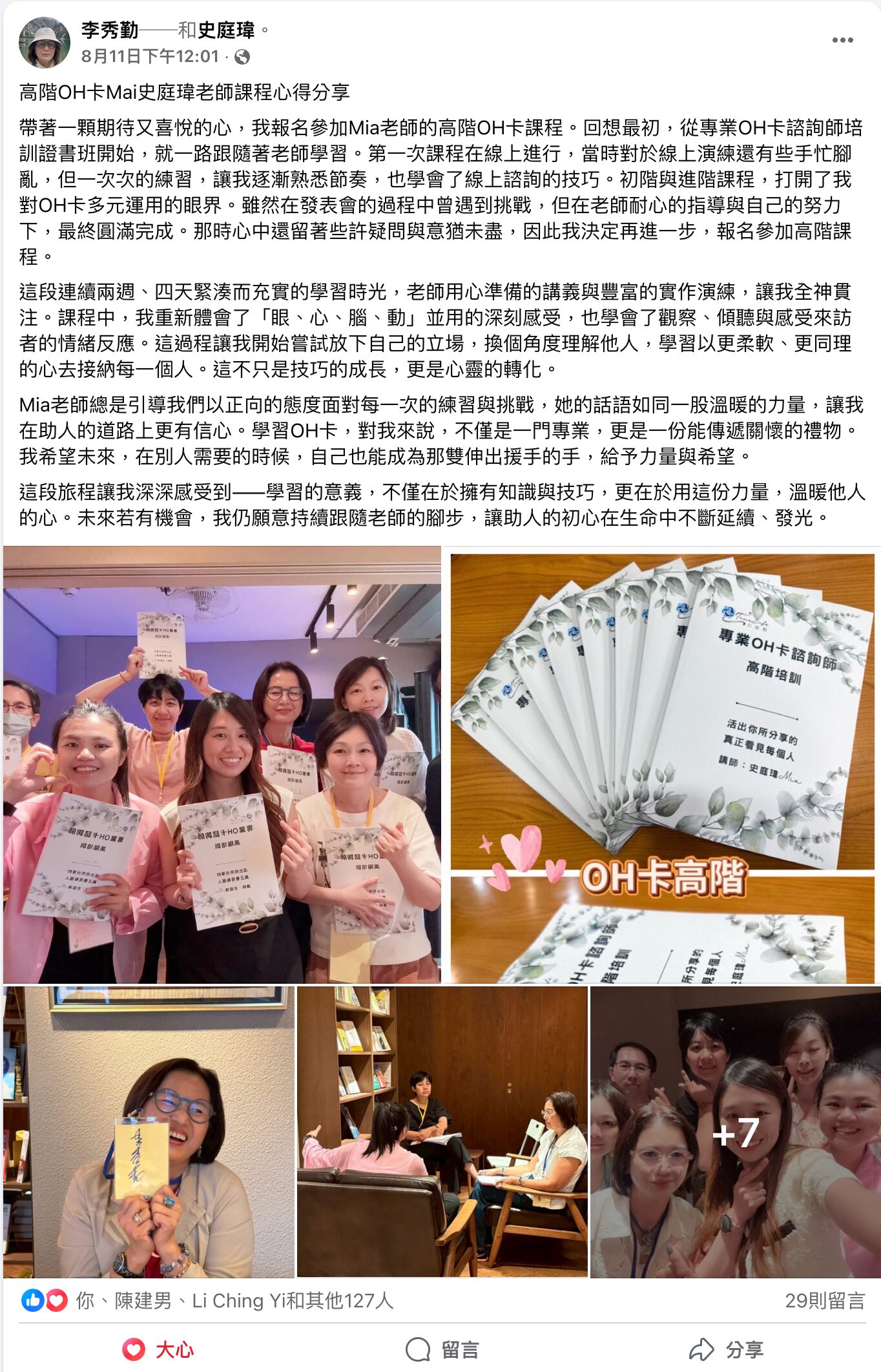 回想最初,從專業OH卡諮詢師培訓證書班開始,就一路跟隨著老師學習。